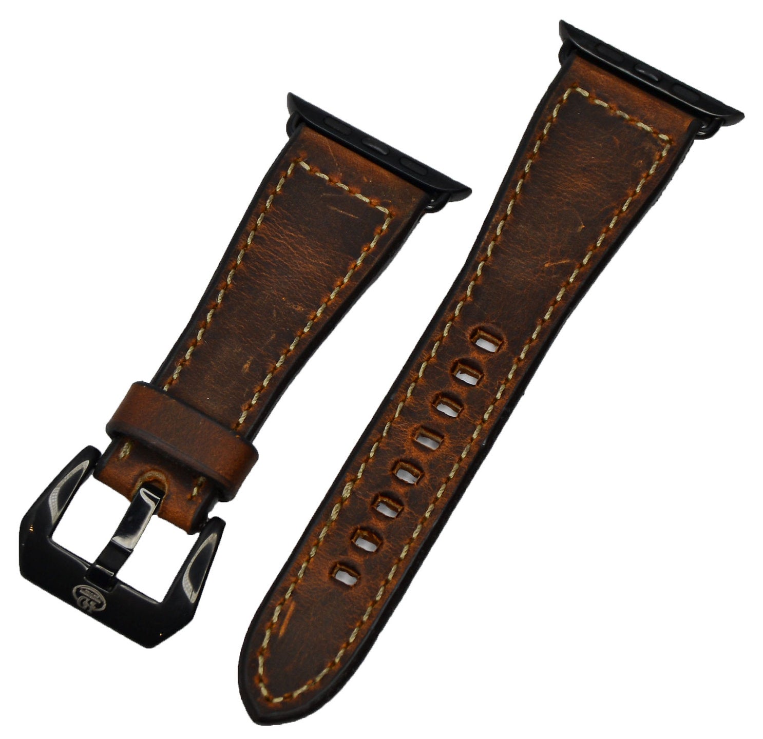 Distressed leather, med brown color with Taupe thread. Bands are produced using two layers of premium quality leathers. Distressed leather on top, lined with english bridle leather liner to produce an extremely durable, long lasting band. Smooth grain English bridle on the bottom side provides additional comfort and resistance to moisture.