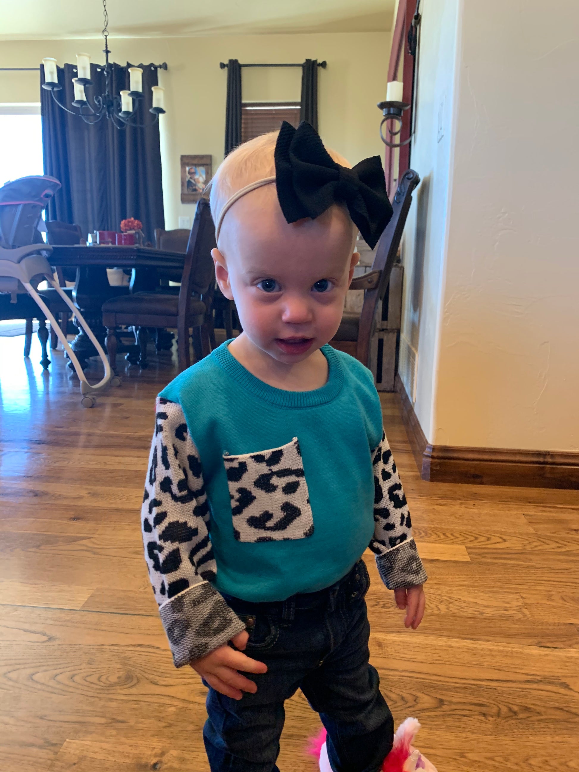 Matching Sibling: https://betruewestern.com/collections/new-arrivals/products/crazy-train-kids-frankly-my-dear-turquoise-and-leopard-knit-sweater