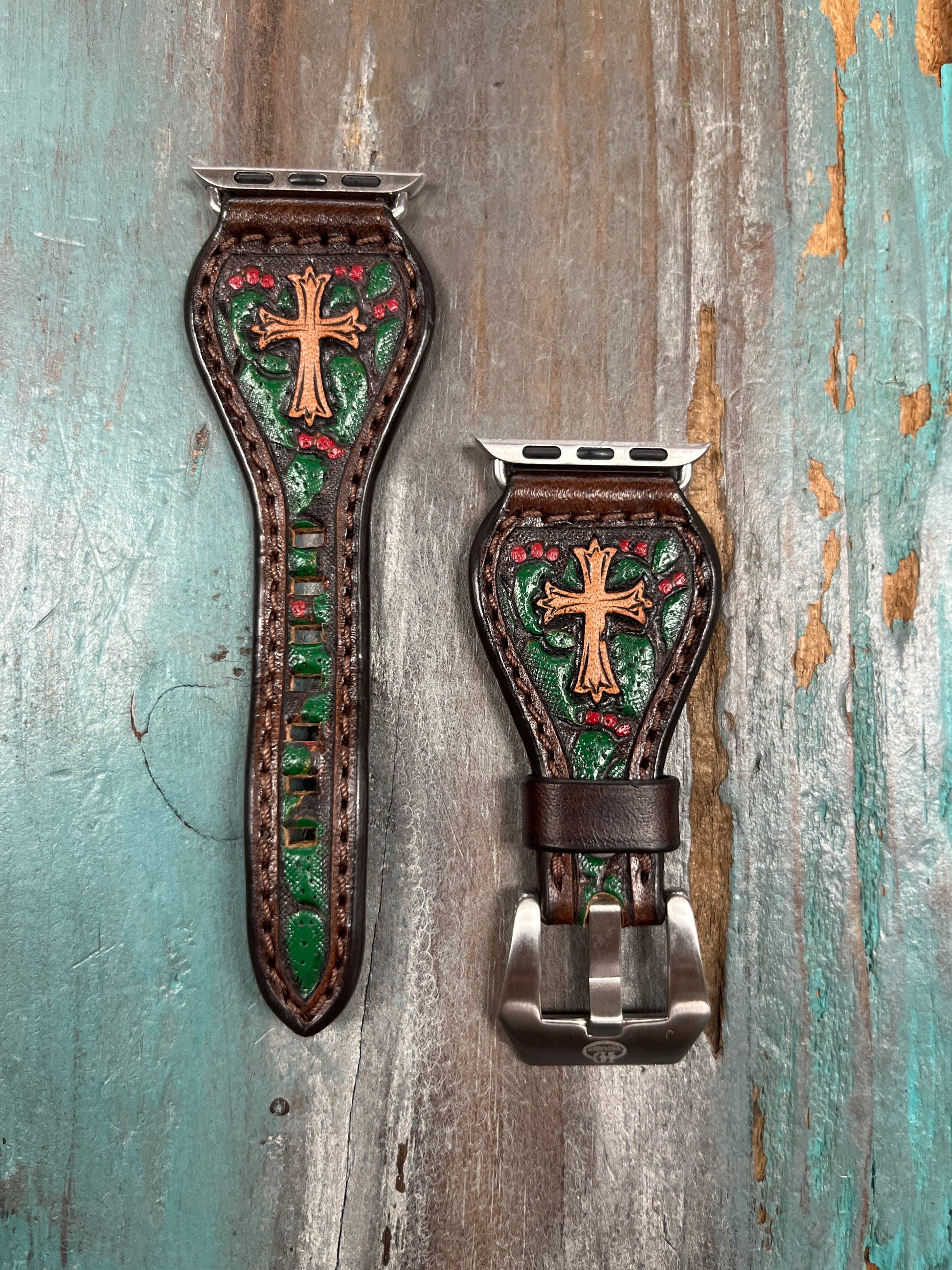 Leather Apple Watch Band Hand Carved Cactus with Cross Design
