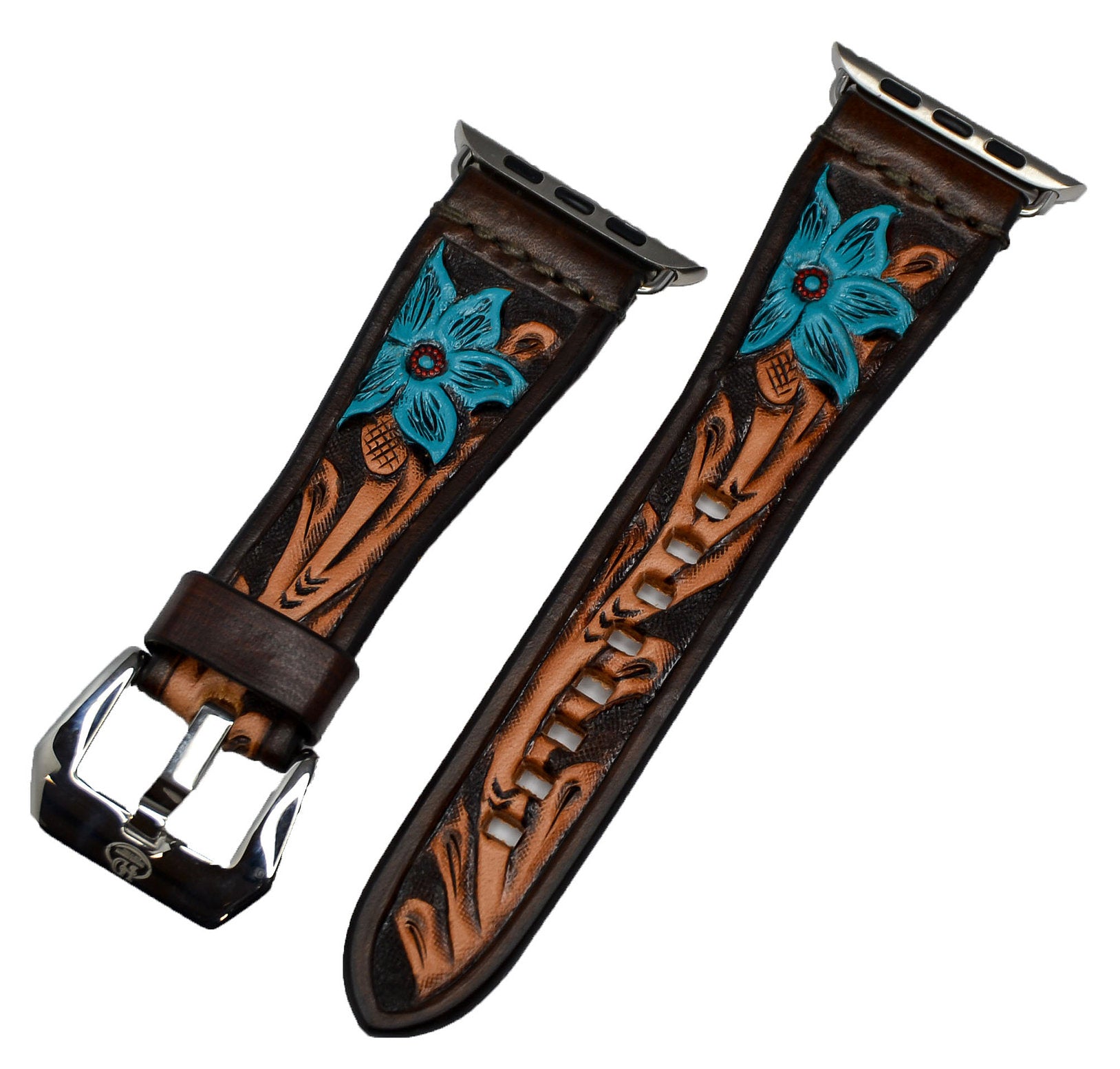 Hand Carved and painted leather watchband. Hand carved Floral design with Turquoise flower, dyed background and antique finish.