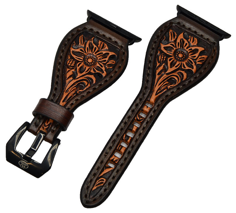 Hand Carved leather watchband. Hand carved floral pattern, hand dyed brown background and border.