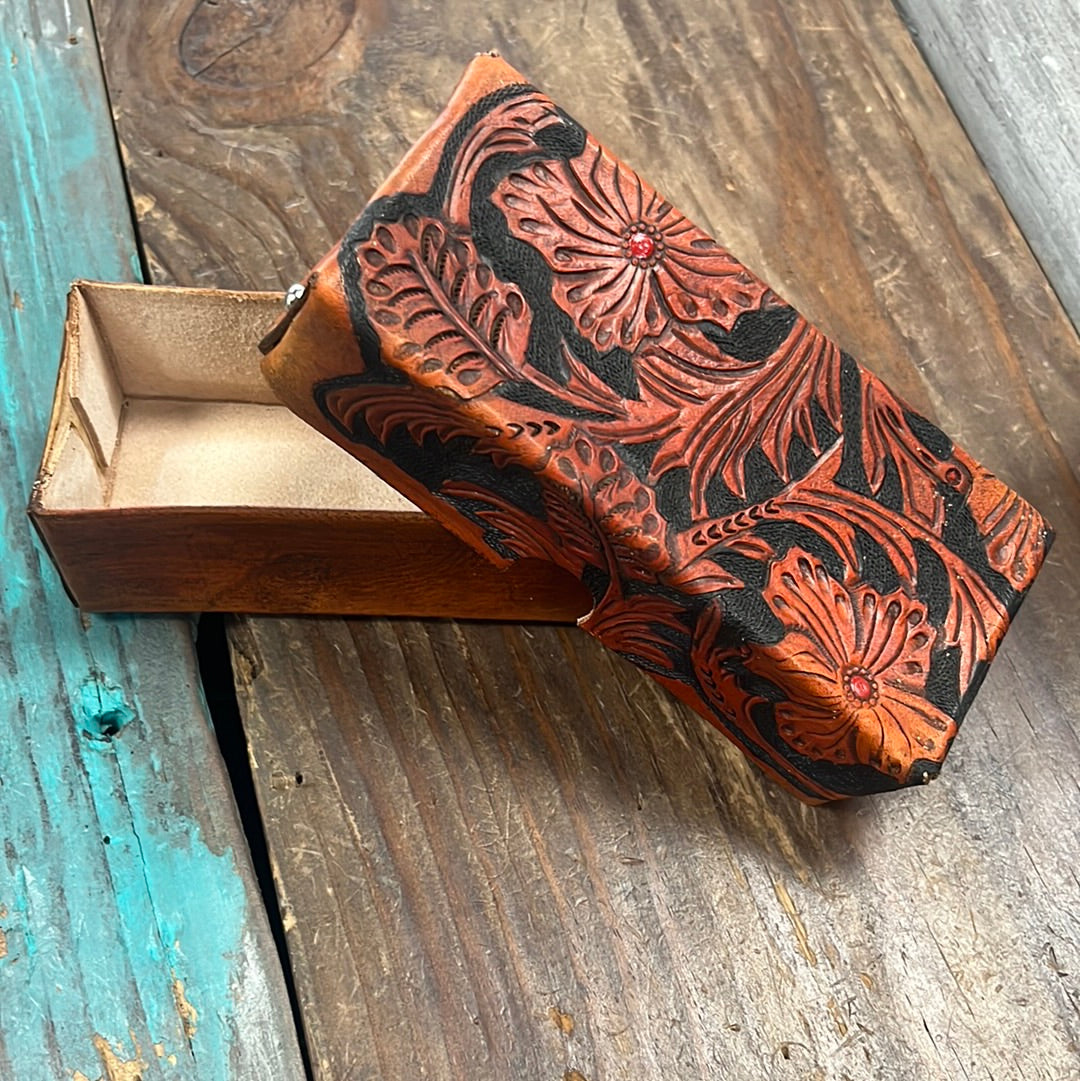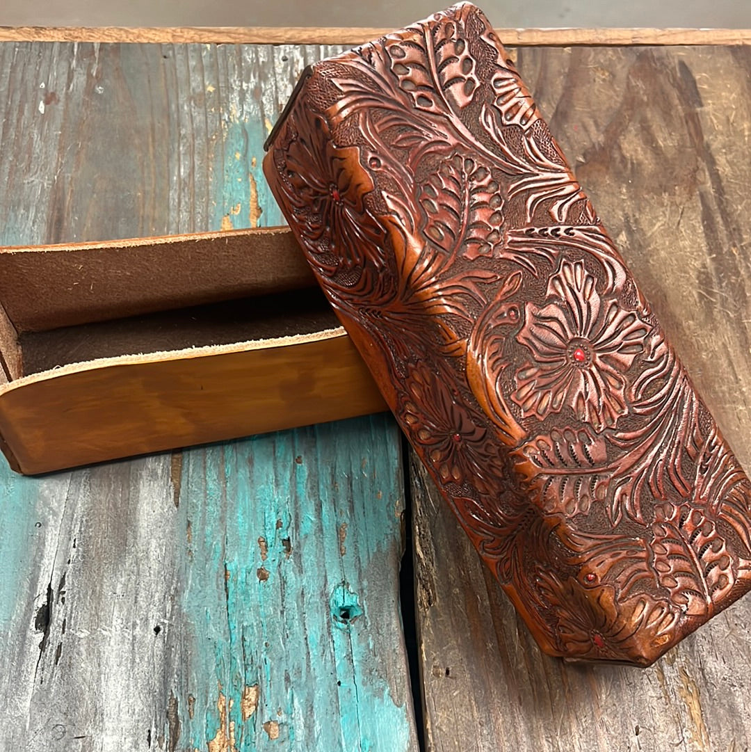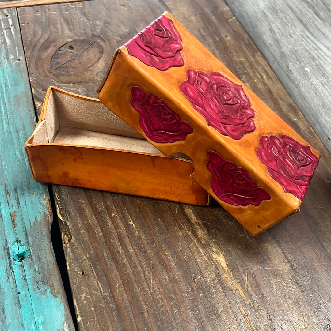 These are rectangle boxes that are all leather tooled and make perfect Jewelry cases for traveling or just to keep on your dresser.