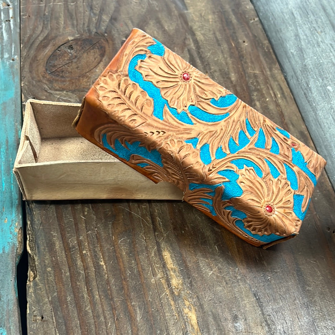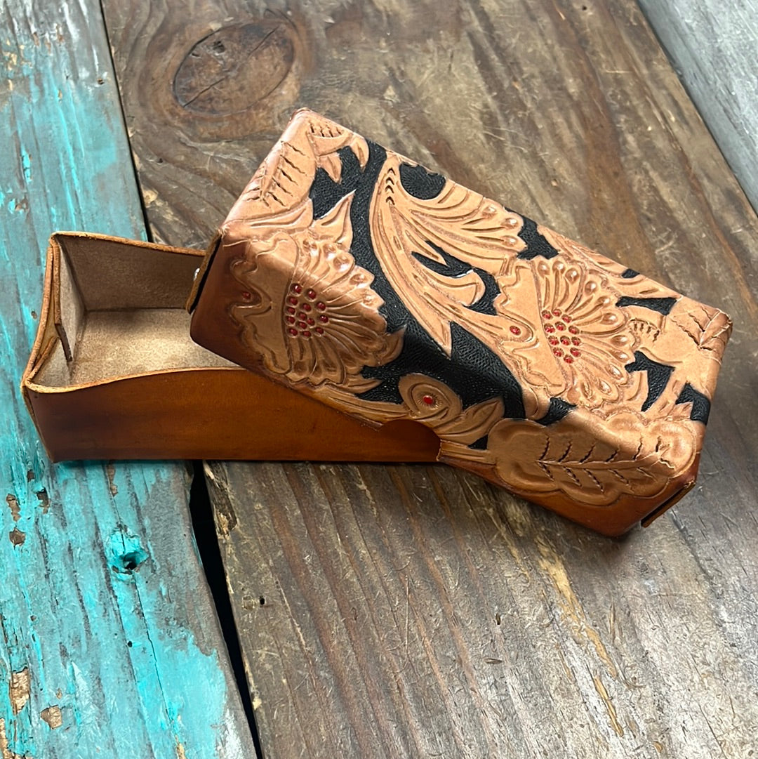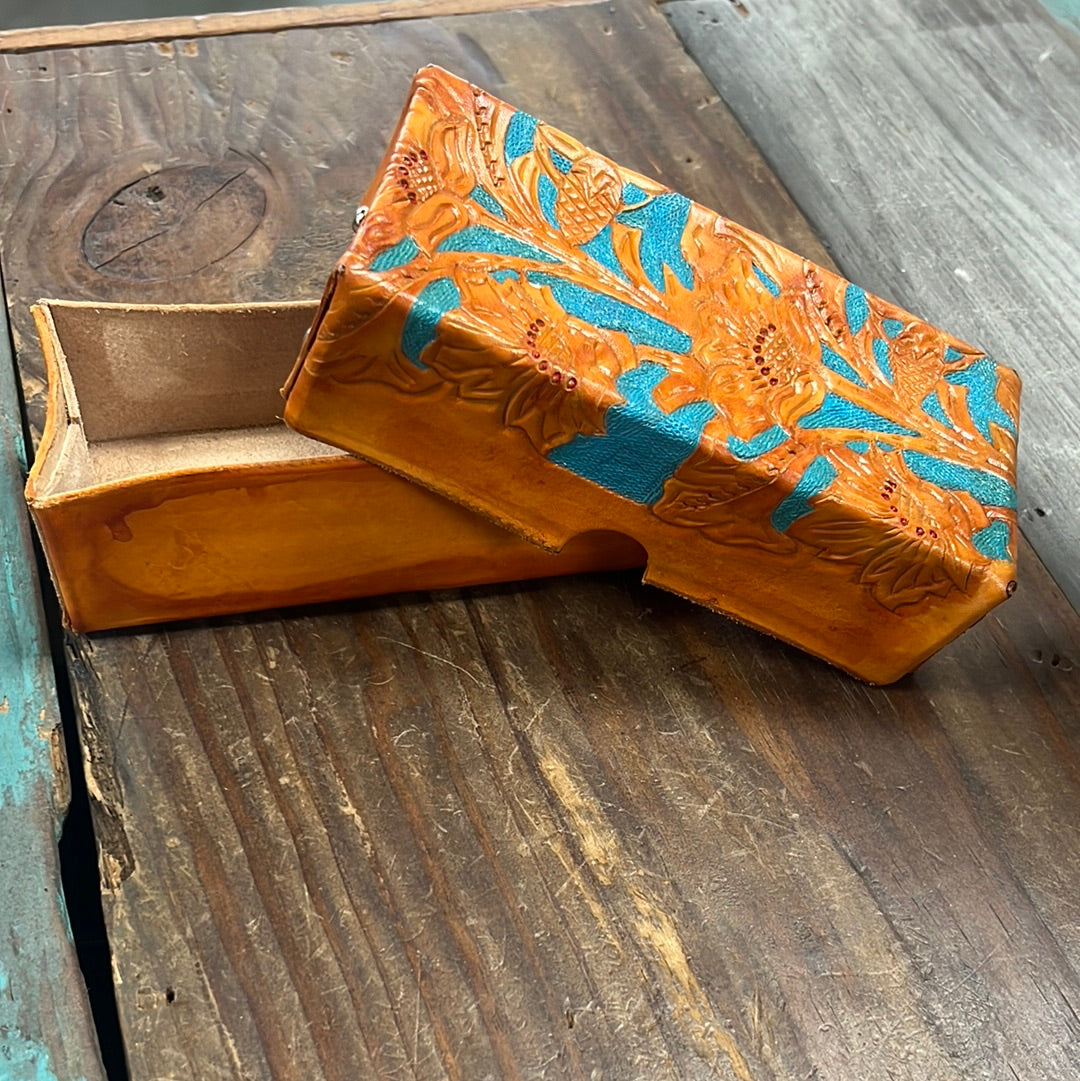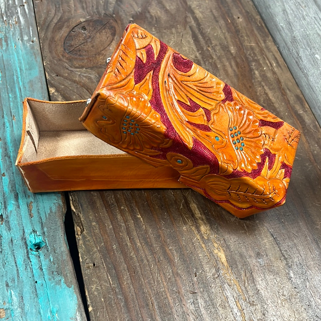 These are rectangle boxes that are all leather tooled and make perfect Jewelry cases for traveling or just to keep on your dresser.