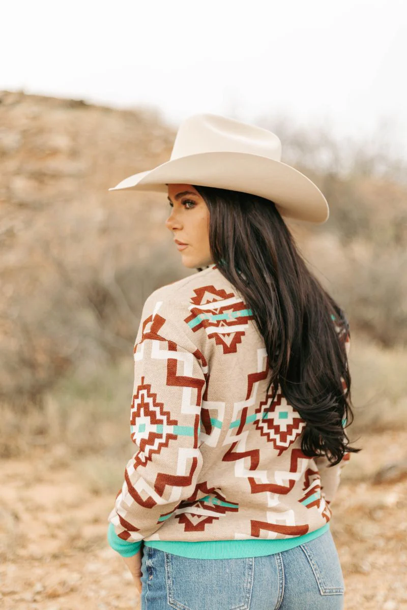 This tan sweater features playful pops of turquoise and a unique Aztec design.