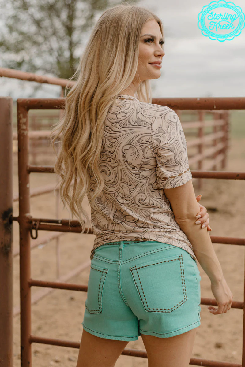 Get ready to Holler with this playful HICKORY HOLLER TOP! With its cream tooled v-neck and brown buckstitching on the sleeves, neckline, and bottom, this top adds a touch of quirky style to any outfit. Perfect for those who don't take themselves too seriously.