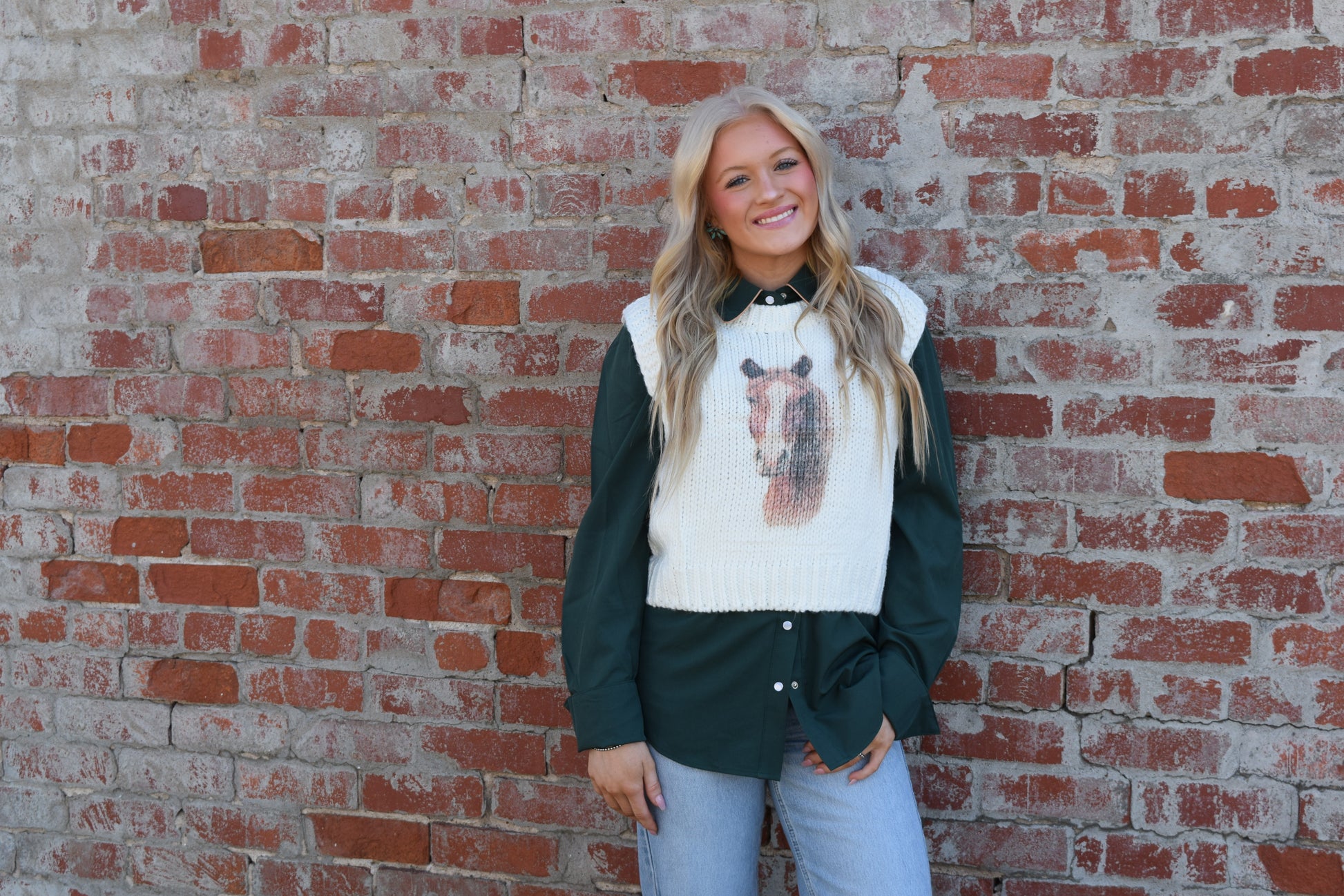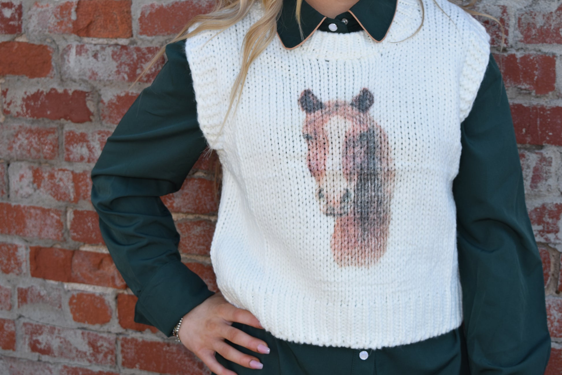 Hand-Knit Horse Graphic Sweater Vest – Cream