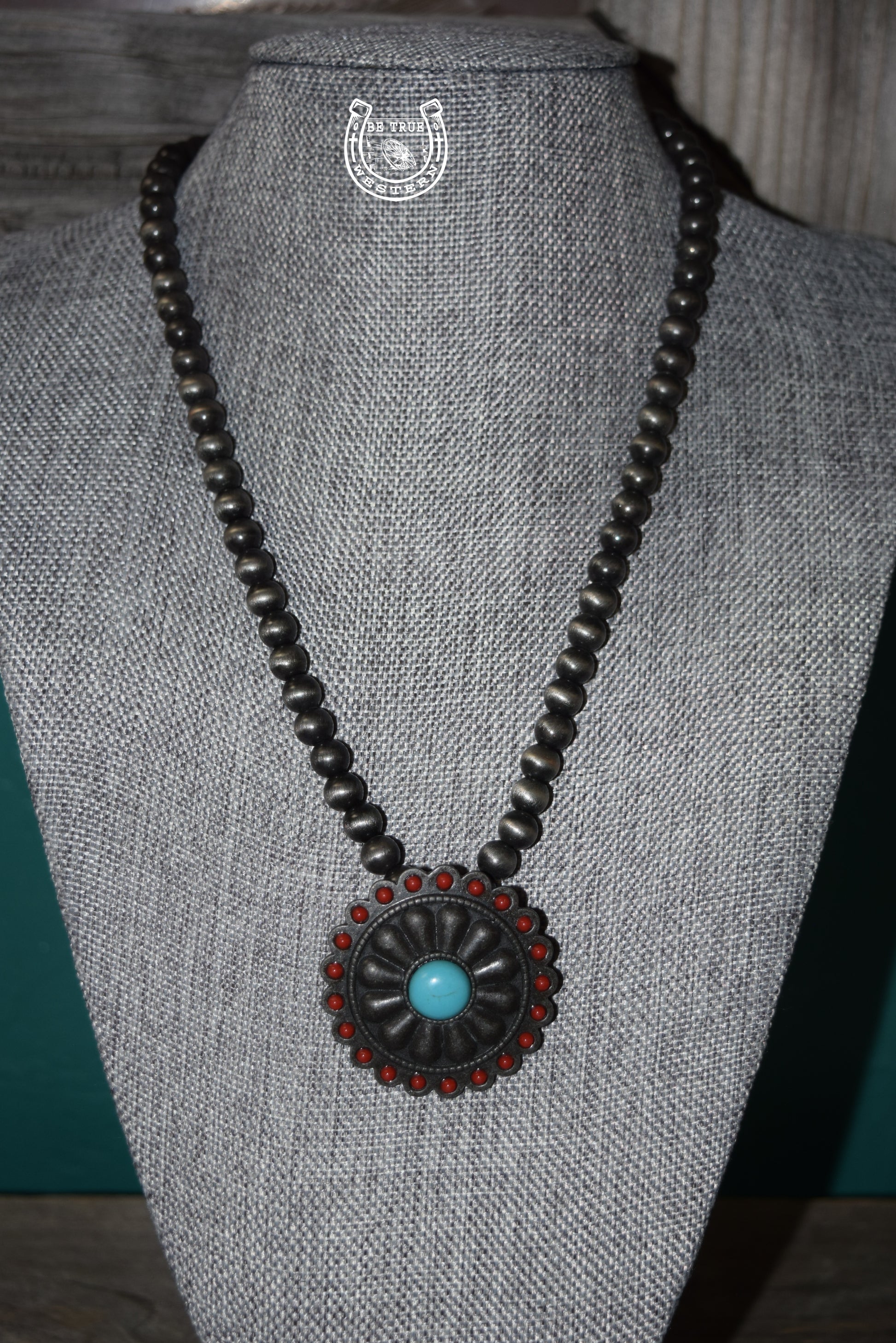Expertly crafted Navajo Pearly Necklace with Red and Turquoise Concho is a true statement piece
