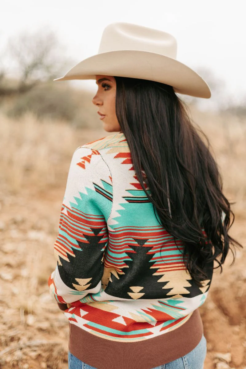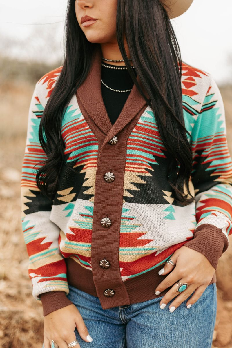 With a bold and vibrant Aztec-inspired design in brown, turquoise, cream, and red, this button up sweater is sure to make a statement.